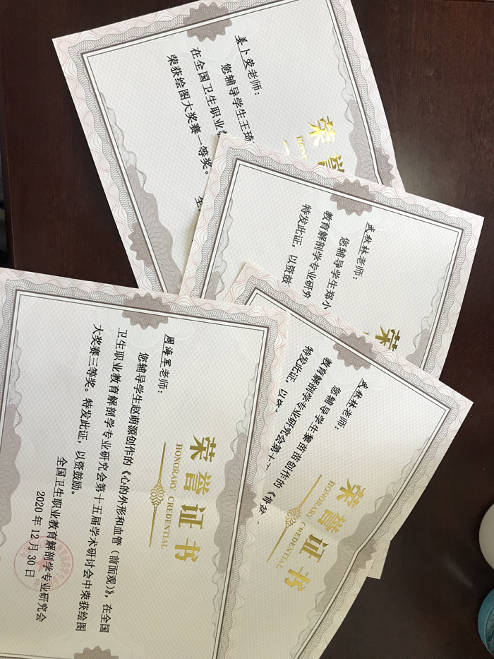 在2020年第十五届全国卫生职业教育解剖学专业研究会举办的绘图大赛中,我院学生王琦琦创作的《心的外形和血管(后下面观)》荣获一等奖,郑小荷创作的《头肌的侧面观》荣获二等奖,黎苗苗创作的《骨盆(女性)》荣获三等奖,赵萌源创的《心的外形和血管(前面观)》荣获三等奖。